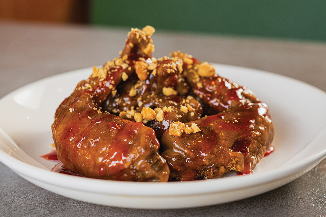 From there, the menu opens up. The Nuoc Cham wings lean into that classic Vietnamese balance — sweet, salty, acidic, and just enough funk to keep things interesting. Nuoc Cham is a versatile Vietnamese dipping sauce, a staple in Vietnamese cuisine, made from a base of fish sauce, lime juice, sugar, and water, with additions like garlic and chili for a balance of salty, sweet, sour, and spicy flavors. The Vietnamese Buffalo wings take something familiar and sharpen it, adding depth where traditional buffalo often stops short. Then there are the swings: PB & J, Fire Loops, Sticky Orange Chicken, Garlic Parmesan and Mango Habanero.