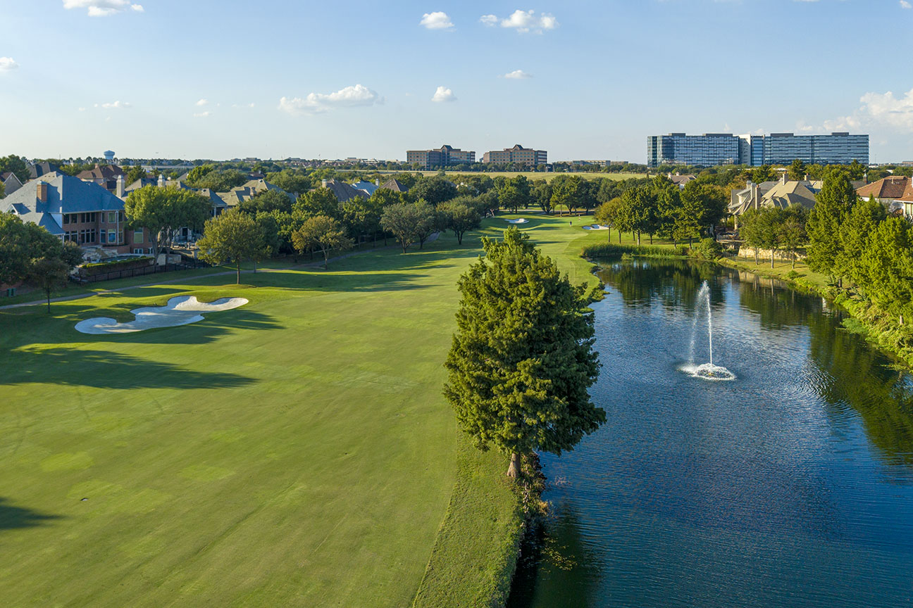 If you remember watching the Byron Nelson when it was still at TPC, then you likely remember the drama No. 17 and No. 18 could bring. 17 is one of the most famous par 3s in DFW golf, with its picturesque, downhill, over-water iron shot. It can play close to 200 yards for the pros, but for regular Joes, it will top out about 175. It’s best to not mess with pins tucked on the right, but pins middle or left can be a green light. It’s also a great place to get some photos or video your swing just in case lightning strikes and someone holes one.