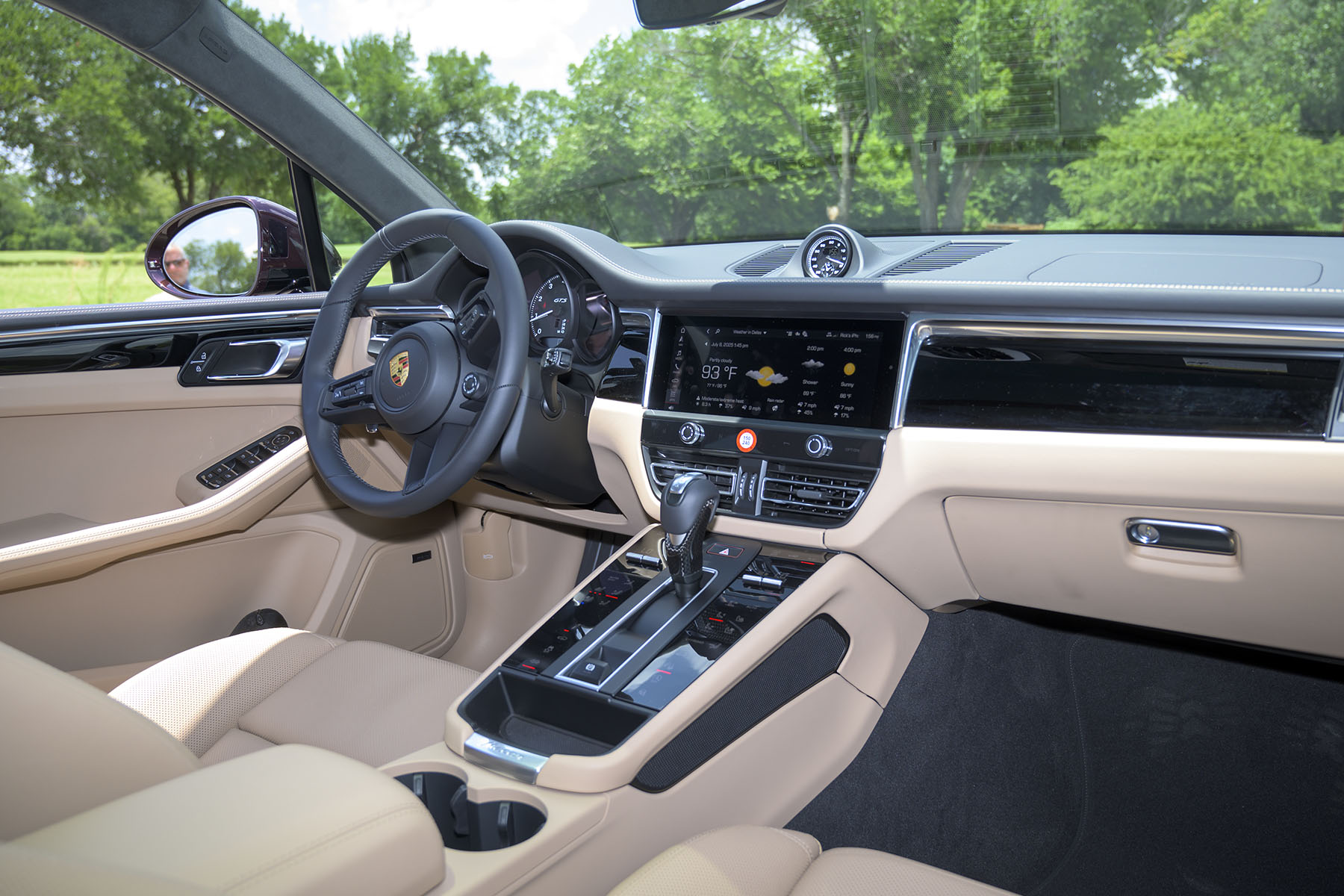 The Macan possesses Porsche’s unmistakably upscale, sporty interior. Fit, finish and materials are top-notch. Creature comforts abound in the cocoon, and the Black/Mohave Beige cowhide leather appointments add to the allure, including the dash. Attractive trim and a perfectly formed sport steering wheel (heated!) are excellent. I dig the three analog instrumentation displays … deliciously old-school, as well.