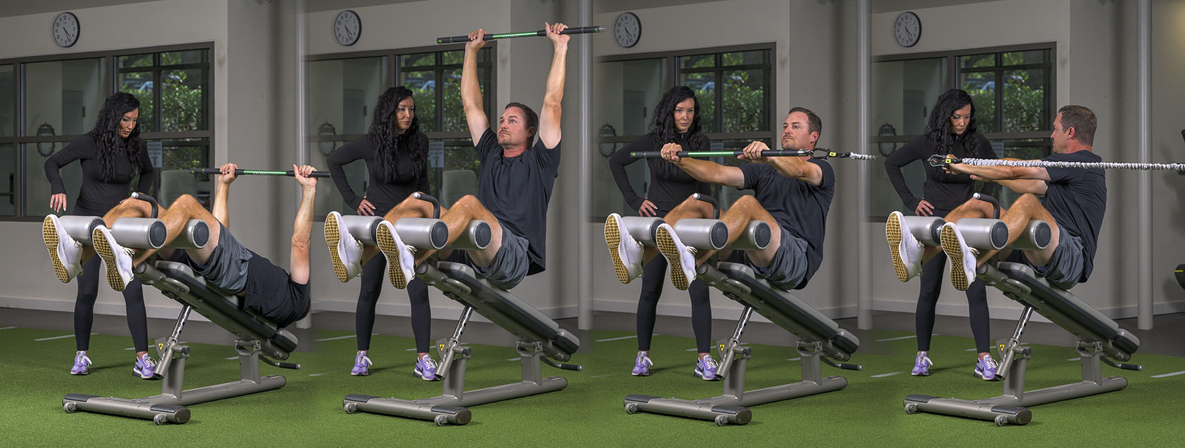Decline Bench Sit-Up with Overhead Press and Rotation – Lights up the core, challenges rotation, and hydrates fascia through spinal flexion + extension