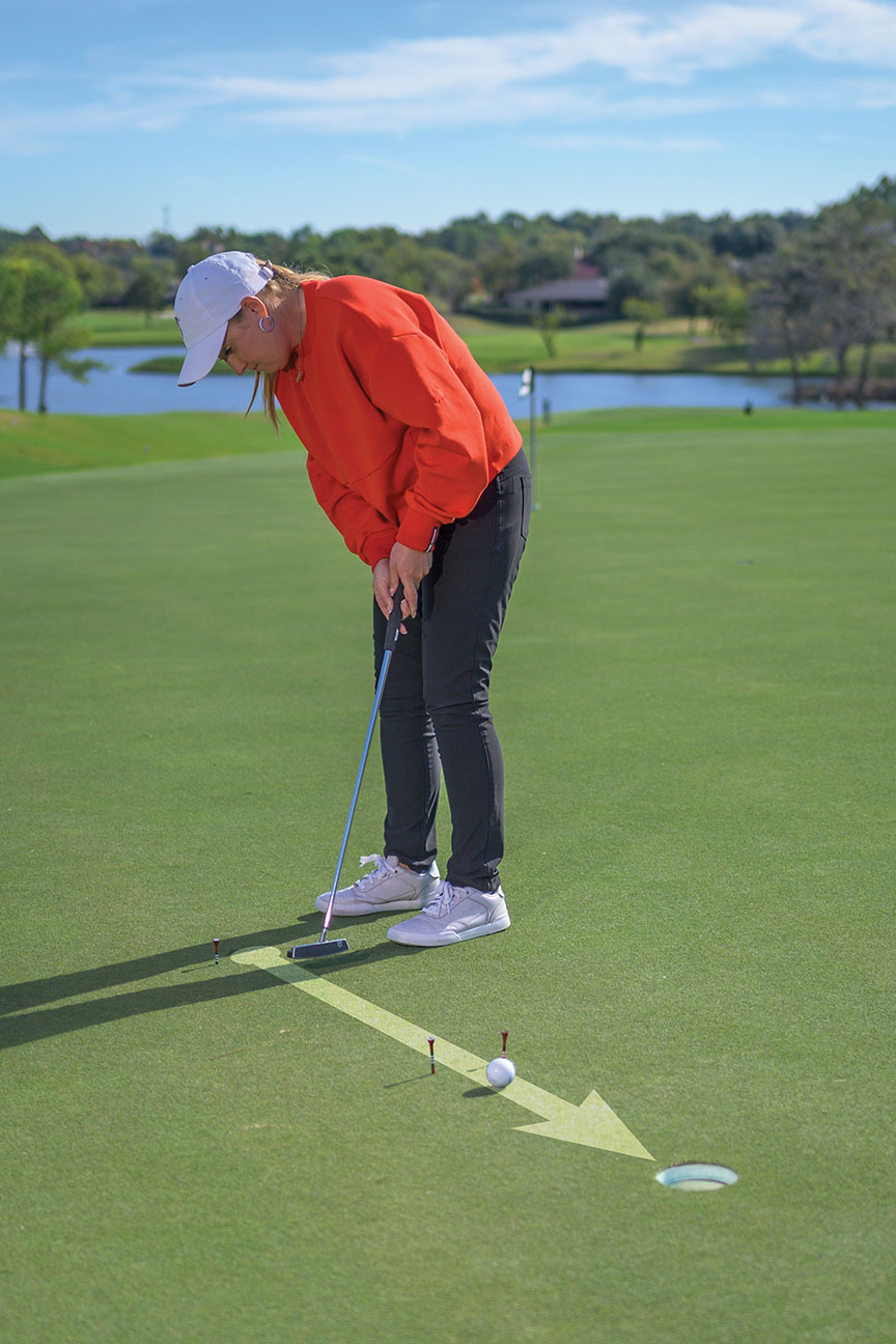 Place two tees 3-6 feet in front of you slightly wider than your putter head, forming a gate on the line you want to putt.