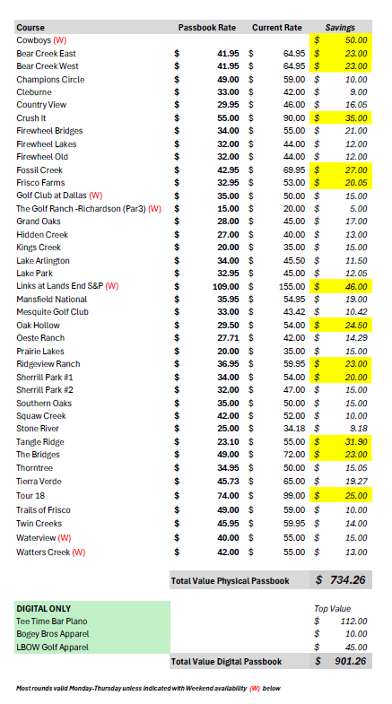 CLICK HERE TO VIEW course directory of included passbook discounts and savings. (Use icons in top right increase size) Most rounds Monday-Thursday only. Fee includes 18-holes with cart for 1 golfer. Weekend availability at Cowboys, Golf Club Dallas, Golf Ranch, Waterview and Watters Creek.